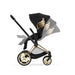 The CYBEX PRIAM 4 stroller combines timeless design elements with new features that make life even easier and meet your highest expectations. The unique one-pull harness helps you secure your child in the stroller in seconds, with just one hand. One frame enables three different modes of use: from birth with the PRIAM 4/e-PRIAM 2 Lux carry cot or any CYBEX infant car seat (both sold separately), and later with the seat unit as a luxurious parent-facing or forward-facing stroller. In his second collaboration with CYBEX, Jeremy Scott throws himself back into revolutionary stuff, shifting old paradigms by creating heaven on earth. Jeremy Scott's signature angel wings adorn the capsule collection with the slogan "Adults Suck Then You Are One". The gold of the angel wings forms an elegant contrast to the black design of the PRIAM. An exciting mix of Jeremy Scott's pop art and groundbreaking, functional design by CYBEX - a meeting of the heavenly and devilish kind.